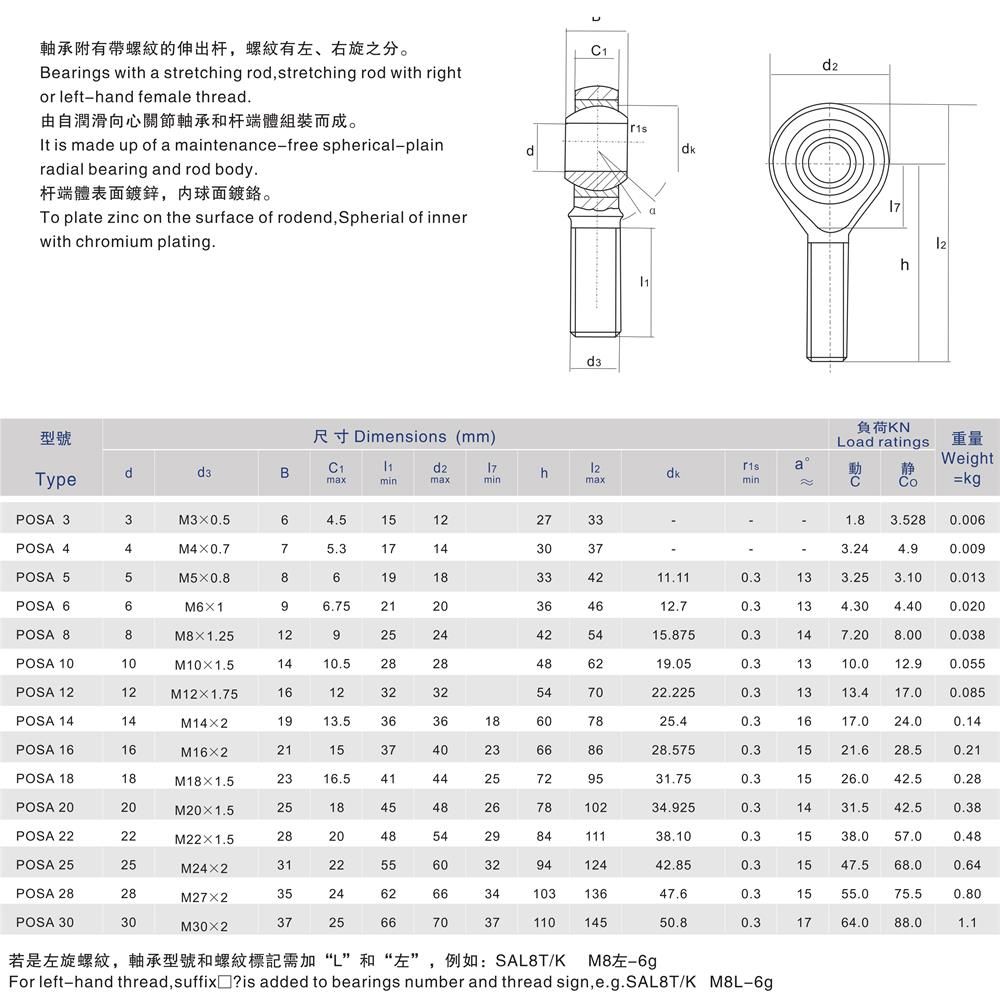 產品名稱:POSA外螺紋自潤滑桿端關節軸承
